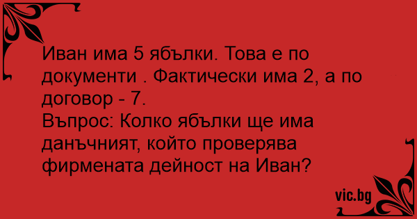 Въпрос: Колко ябълки ще има данъчният, който проверява фирмената дейност на Иван?