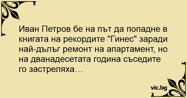 Иван Петров бе на път да попадне в книгата на рекордите "Гинес" заради най-дълъг ремонт на апартамент, но на дванадесетата година съседите го застреляха…