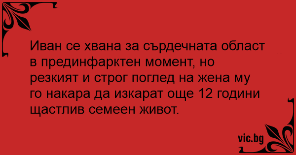 Иван се хвана за сърдечната област в прединфарктен момент, но резкият и строг поглед на жена му го накара да изкарат още 12 години щастлив семеен живот.