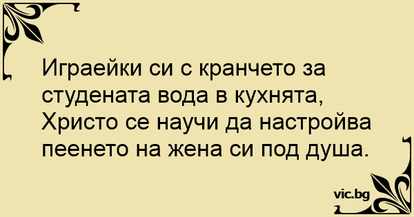 Играейки си с кранчето за студената вода в кухнята, Христо се научи да настройва пеенето на жена си под душа.