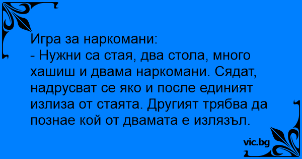 - Нужни са стая, два стола, много хашиш и двама наркомани. Сядат, надрусват се яко и после единият излиза от стаята. Другият трябва да познае кой от двамата е излязъл.