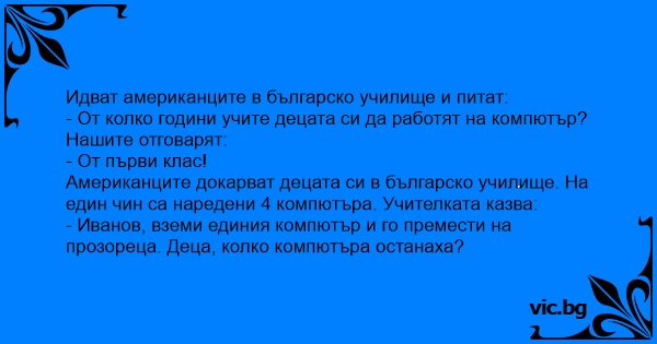Американците докарват децата си в българско училище. На един чин са наредени 4 компютъра. Учителката казва: