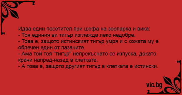 Идва един посетител при шефа на зоопарка и вика: - Тоя единия ви тигър изглежда леко недобре. - Това е, защото истинският тигър умря и с кожата му е облечен един от пазачите. - Ама той тоя "тигър" непрекъснато се изпуска, докато крачи напред-назад в клетката. - А това е, защото другият тигър в клетката е истински.