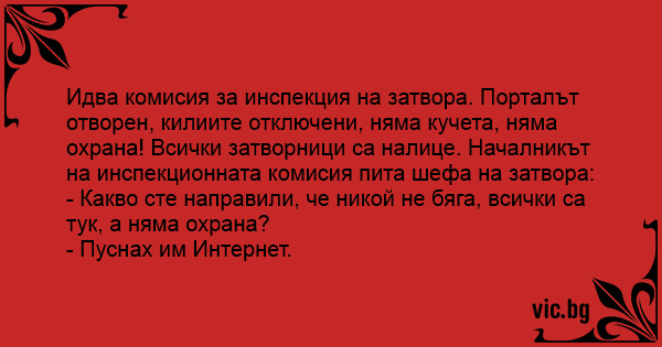 Идва комисия за инспекция на затвора. Порталът отворен, килиите отключени, няма кучета, няма охрана! Всички затворници са налице. Началникът на инспекционната комисия пита шефа на затвора: