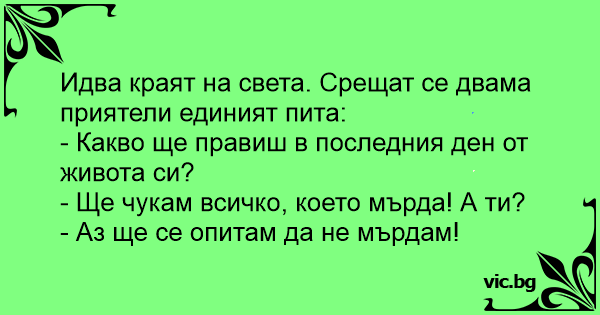 Pienāk pasaules gals. Satiekas divi draugi un viens otram jauta: Pirmais saka: - Ko tu darīsi pēdējā sava mūža dienā? Otrais atbild: - Kā, drāzīšu visu kas kustas! Un tas vaicā, bet tu to darīsi...