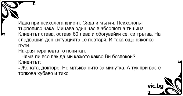 Идва при психолога клиент. Сяда и мълчи. Психологът търпеливо чака. Минава един час в абсолютна тишина. Клиентът става, оставя 60 лева и сбогувайки се, си тръгва. На следващия ден ситуацията се повтаря. И така още няколко пъти.