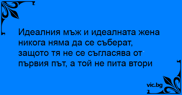 Идеалния мъж и идеалната жена никога няма да се съберат, защото тя не се съгласява от първия път, а той не пита втори