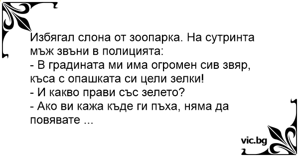 Із зоопарку втік слон. Лунає дзвінок в поліцію: — У мене на городі велика миша рве хвостом капусту. — І що вона з нею робить далі? — Ви не повірите...