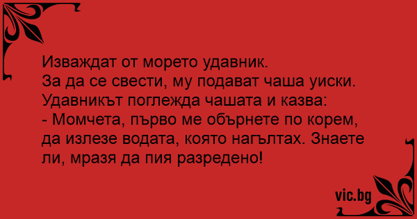 За да се свести, му подават чаша уиски. Удавникът поглежда чашата и казва: