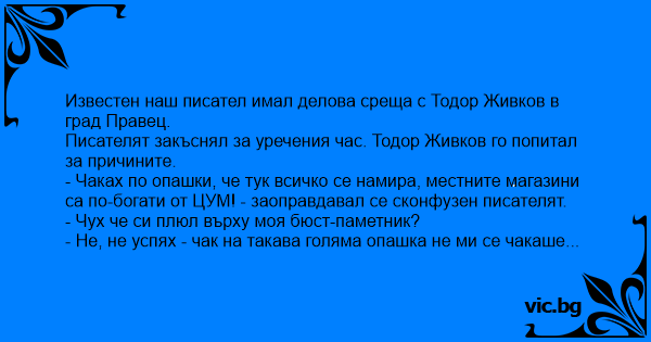 Писателят закъснял за уречения час. Тодор Живков го попитал за причините.