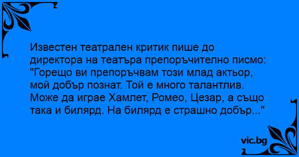 "Горещо ви препоръчвам този млад актьор, мой добър познат. Той е много талантлив. Може да играе Хамлет, Ромео, Цезар, а също така и билярд. На билярд е страшно добър..."