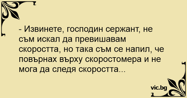 - Извинете, господин сержант, не съм искал да превишавам скоростта, но така съм се напил, че повърнах върху скоростомера и не мога да следя скоростта...