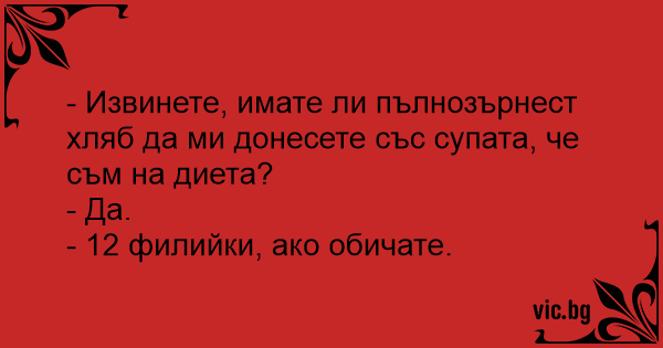 - Извинете, имате ли пълнозърнест хляб да ми донесете със супата, че съм на диета?