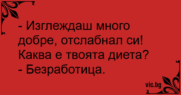 - Изглеждаш много добре, отслабнал си! Каква е твоята диета?