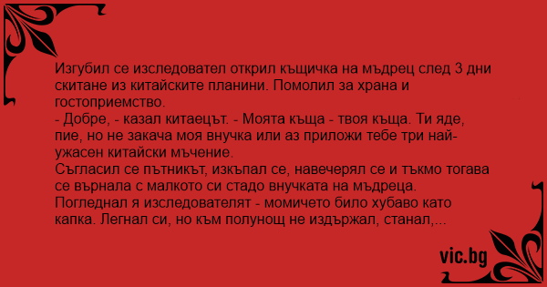 Изгубил се изследовател открил къщичка на мъдрец след 3 дни скитане из китайските планини. Помолил за храна и гостоприемство.
