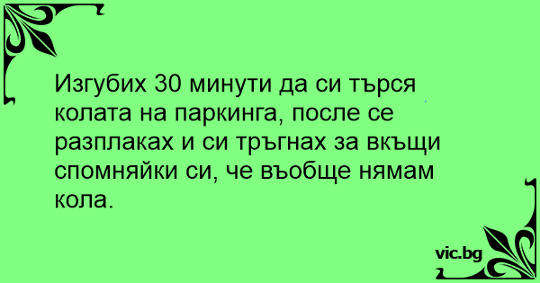 Изгубих 30 минути да си търся колата на паркинга, после се разплаках и си тръгнах за вкъщи спомняйки си, че въобще нямам кола.