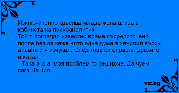 Изключително красива млада жена влиза в кабинета на психоаналитик.