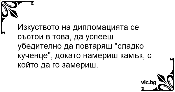 Изкуството на дипломацията се състои в това, да успееш убедително да повтаряш "сладко кученце", докато намериш камък, с който да го замериш.