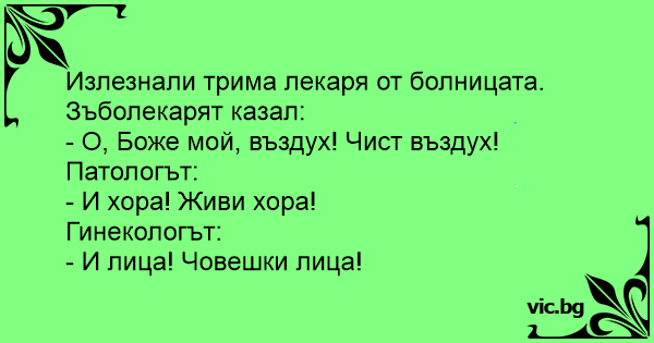 Топла лятна вечер. От болницата излизат патолог и гинеколог. С бавна походка двамата вървят към домовете си, вдишват с пълни гърди свежия въздух и се възхищават на природата. Патологът: