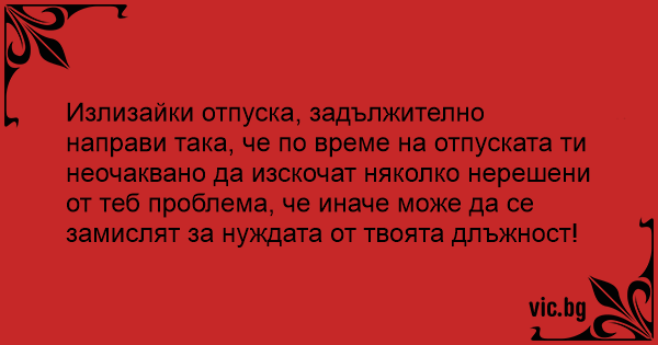 Излизайки отпуска, задължително направи така, че по време на отпуската ти неочаквано да изскочат няколко нерешени от теб проблема, че иначе може да се замислят за нуждата от твоята длъжност!