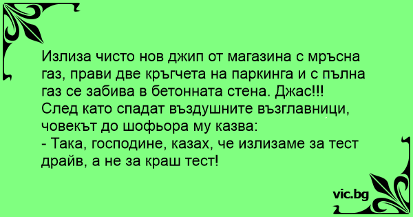 Излиза чисто нов джип от магазина с мръсна газ, прави две кръгчета на паркинга и с пълна газ се забива в бетонната стена. Джас!!!