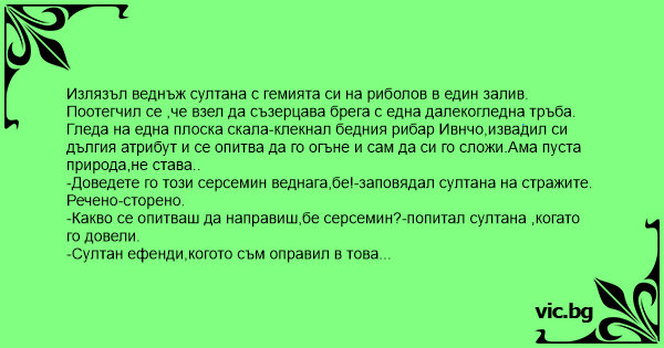-Султан ефенди,когото съм оправил в това царство, човек стана. Само аз си останах беден рибар, та рекох сам да се оправя-и аз да вържа малко двата края..