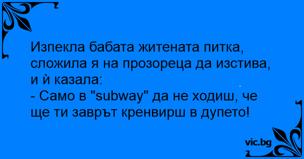 - Само в "subway" да не ходиш, че ще ти заврът кренвирш в дупeto!