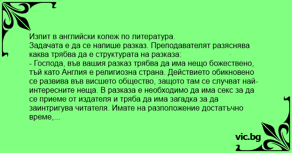 - Господа, във вашия разказ трябва да има нещо божествено, тъй като Англия е религиозна страна. Действието обикновено се развива във висшето общество, защото там се случват най-интересните неща. В разказа е необходимо да има cekc за да се приеме от издателя и тряба да има загадка за да заинтригува читателя. Имате на разположение достатъчно време, започвайте.