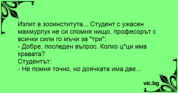 Изпит в зооинститута... Студент с ужасен махмурлук не си спомня нищо, професорът с всички сили го мъчи за "три":