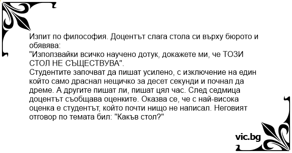 Изпит по философия. Доцентът слага стола си върху бюрото и обявява: