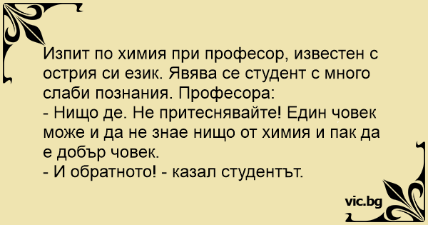 Изпит по химия при професор, известен с острия си език. Явява се студент с много слаби познания. Професора: