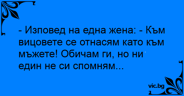 - Изповед на една жена: - Към вицовете се отнасям като към мъжете! Обичам ги, но ни един не си спомням...