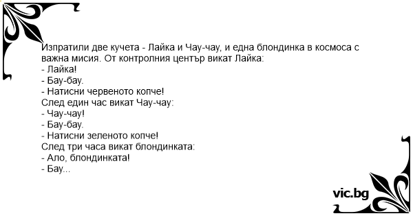 Полицаец и прасе во Вселената Blonde NASA Engineer Zwei Schweine und ein Mantafahrer im Weltraum Пратили две кучета и една блондинка в космоса. Изпратили едно прасе и един милиционер в Космоса, с една совалка. Ad una missione nello spazio partecipano un cane, un gatto ed un carabiniere. Изпращат в космоса две кучета и една блондинка. След известно време от земята викат: - Шаро! - Бау, бау... - Натисни червеното копче! След още една обиколка от земята пак се обаждат: - Лайка! - Бау, бау... - Натисни бялото копче! На третата обиколка: - Блондинката! - Бау, бау... - Що... Eine Raumkapsel, besetzt mit 2 Schweinen und dem Burgenländer Gustl Güssinger, fliegt durchs All. Plötzlich kommt ein Funkspruch: "Hier spricht Houston. Schwein eins, bitte drücken sie den roten Knopf." Schwein eins drückt den roten Knopf. Später kommt ein weiterer Funkspruch: "Hier spricht... Die NASA sucht drei Astronauten. Es findet sich aber nur ein Freiwilliger: ein Österreicher. Die NASA überlegt und schickt dann zwei Schweine und den Österreicher mit der Rakete ins All. Nach zwölf Stunden funkt Houston zur Raumkapsel: "Schwein 1 bitte melden!" Es dauert eine Minute, dann die... NASA beslutade för några år sedan att skicka upp den första blonda astronauten i rymden. Hennes enda sällskap var en apa och hennes instruktioner var att lyda de instruktioner hon fick när en röd lampa tändes. En timme efter start tändes en grön lampa och en röst instruerade att kontrollera... En norrman skulle för första gången skickas ut i rymden. Som sällskap skulle han ha en apa och när en röd lampa tändes, skulle han följa instruktionerna som gavs. Enkelt, tänkte norrmannen och så... En un experimento de la NASA tenían a dos monos y un atlante, haciendo comunicación con los monos la NASA dice: NASA a mono 1: Encienda motores (el mono encendió los motores) NASA a mono 2:... In Amerika wurde in den 70er Jahren ein neuartiges Weltraumprojekt gestartet: Ein Schimpanse und eine Blondine starten zu einer mehrjährigen Reise durchs Universum. Beiden wird nur ein Umschlag... A Nasa enviou ao espaço 3 macacos e 1 português: — Nasa para a Nave. — Macaco número 1, configurar painel de controle da espaçonave. — Configuração efetuada! — Macaco número 2, verificar... Felküldenek két malacot és egy rendőrt az űrbe. Mielőtt elindítanák az űrhajót mindenki elmondja, hogy mi az ő feladata. - Egyes számú malac, Önnek mi a feladata? - kérdezi az operátor. - Én...