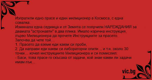 Изминала една седмица и от Земята се получили НАРЕЖДАНИЯ за двамата "астронавти" в два плика. Имало изрична инструкция, първо Милиционера да прочете Инструкциите за прасето.
