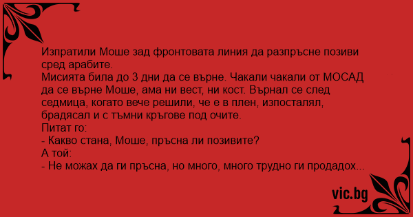 Мисията била до 3 дни да се върне. Чакали чакали от МОСАД да се върне Моше, ама ни вест, ни кост. Върнал се след седмица, когато вече решили, че е в плен, изпосталял, брадясал и с тъмни кръгове под очите.