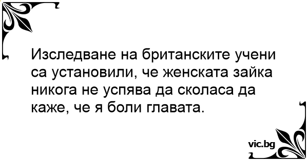Изследване на британските учени са установили, че женската зайка никога не успява да сколаса да каже, че я боли главата.