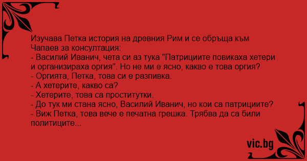 - Василий Иванич, чета си аз тука "Патрициите повикаха хетери и организираха оргия". Но не ми е ясно, какво е това оргия?