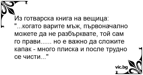 Из готварска книга на вещица: "...когато варите мъж, първоначално можете да не разбърквате, той сам го прави...... но е важно да сложите капак - много плиска и после трудно се чисти..."