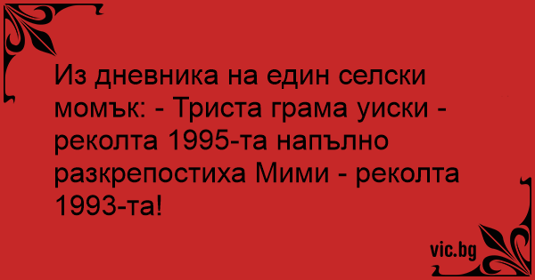 Из дневника на един селски момък: - Триста грама уиски - реколта 1995-та напълно разкрепостиха Мими - реколта 1993-та!