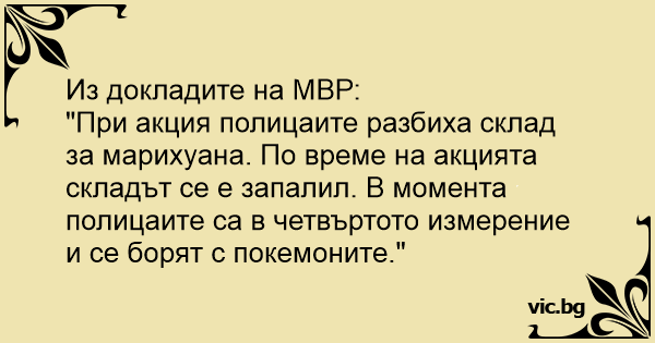 "При акция полицаите разбиха склад за марихуана. По време на акцията складът се е запалил. В момента полицаите са в четвъртото измерение и се борят с покемоните."