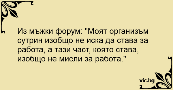 Из мъжки форум: "Моят организъм сутрин изобщо не иска да става за работа, а тази част, която става, изобщо не мисли за работа."