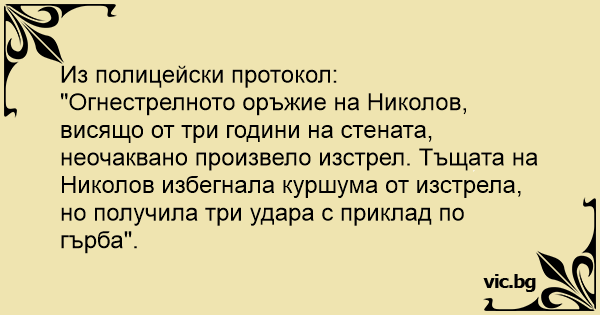 "Огнестрелното оръжие на Николов, висящо от три години на стената, неочаквано произвело изстрел. Тъщата на Николов избегнала куршума от изстрела, но получила три удара с приклад по гърба".