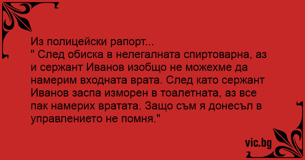" След обиска в нелегалната спиртоварна, аз и сержант Иванов изобщо не можехме да намерим входната врата. След като сержант Иванов заспа изморен в тоалетната, аз все пак намерих вратата. Защо съм я донесъл в управлението не помня."