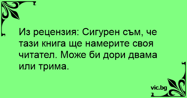 Из рецензия: Сигурен съм, че тази книга ще намерите своя читател. Може би дори двама или трима.