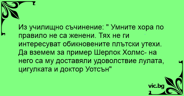 Из училищно съчинение: " Умните хора по правило не са женени. Тях не ги интересуват обикновените плътски утехи. Да вземем за пример Шерлок Холмс- на него са му доставяли удоволствие лулата, цигулката и доктор Уотсън"