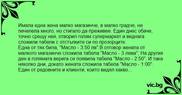 Една от тях била, "Масло - 3:50 лв".В отговор жената от малкото магазинче сложила табела "Масло - 3 лева", На другия ден в голямата верига се появила табела "Масло - 2:50". И така няколко дни, докато жената сложила табела "Масло - 1:00".