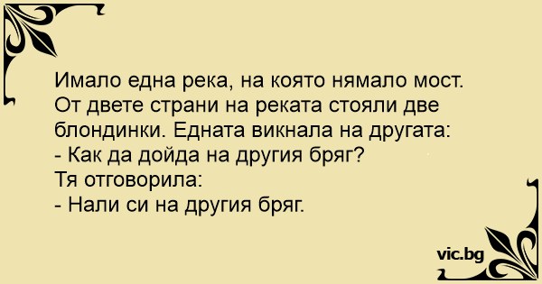 От двете страни на реката стояли две блондинки. Едната викнала на другата: