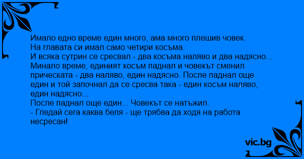 Минало време, единият косъм паднал и човекът сменил прическата - два наляво, един надясно. После паднал още един и той започнал да се сресва така - един косъм наляво, един надясно...