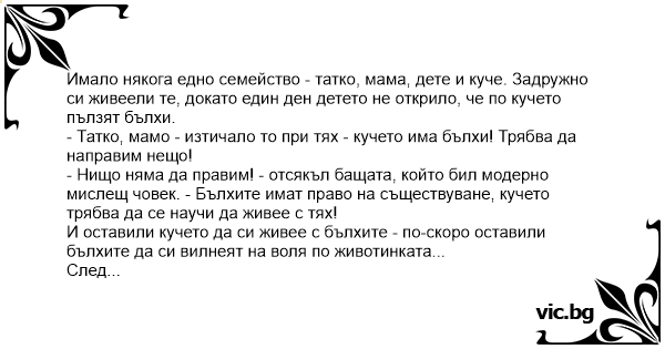 Имало някога едно семейство - татко, мама, дете и куче. Задружно си живеели те, докато един ден детето не открило, че по кучето пълзят бълхи.