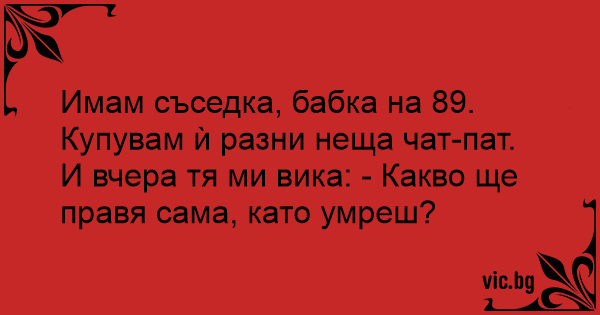 Имам съседка, бабка на 89. Купувам ѝ разни неща чат-пат. И вчера тя ми вика: - Какво ще правя сама, като умреш?